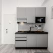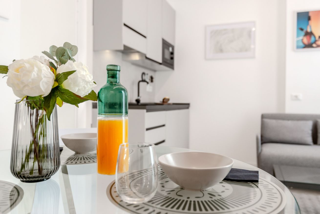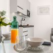 The apartment has a modern, fully equipped kitchen with a Moka pot, kettle, and microwave, ideal for preparing meals independently.