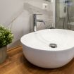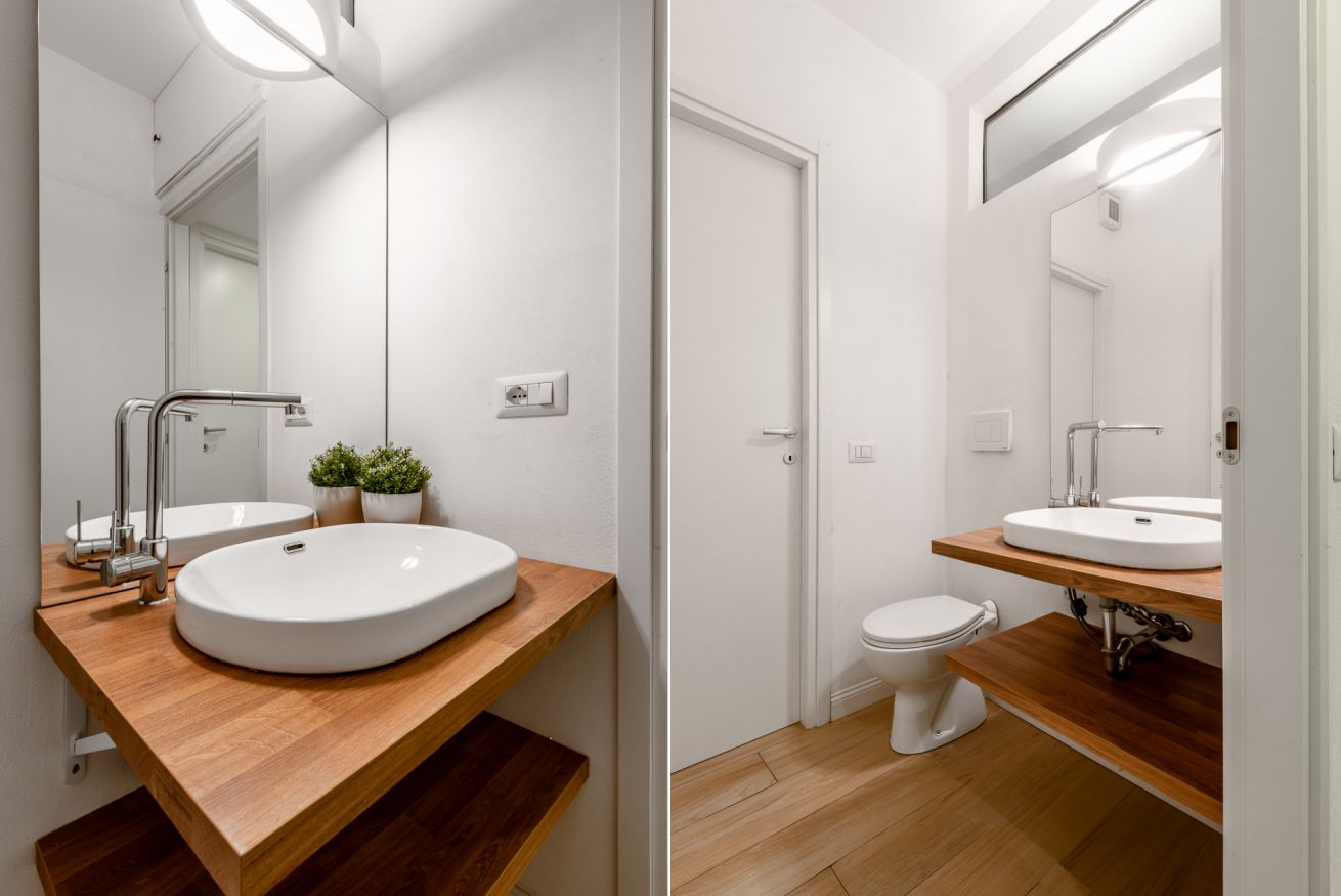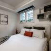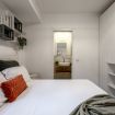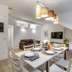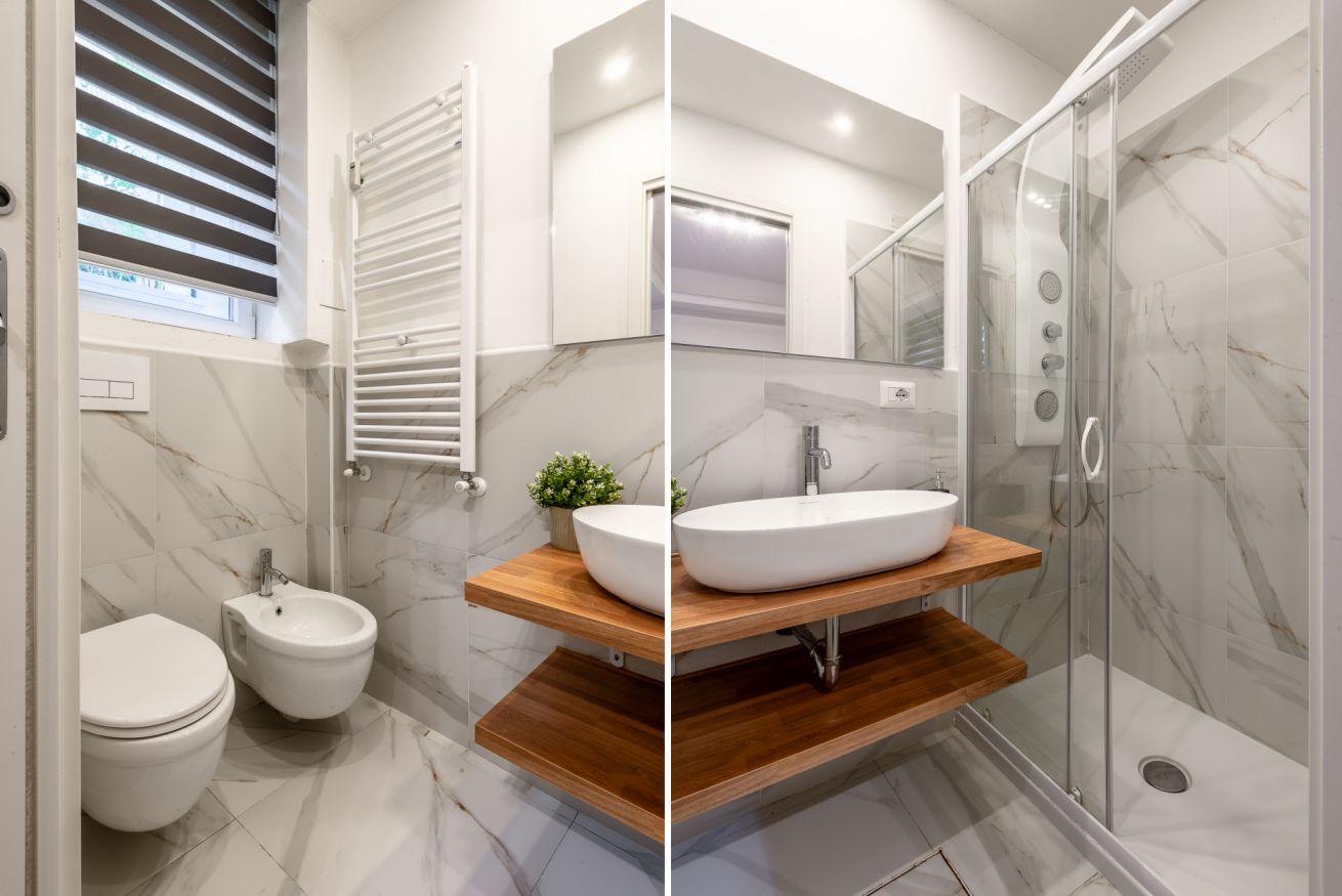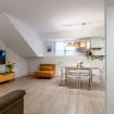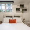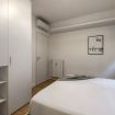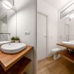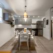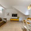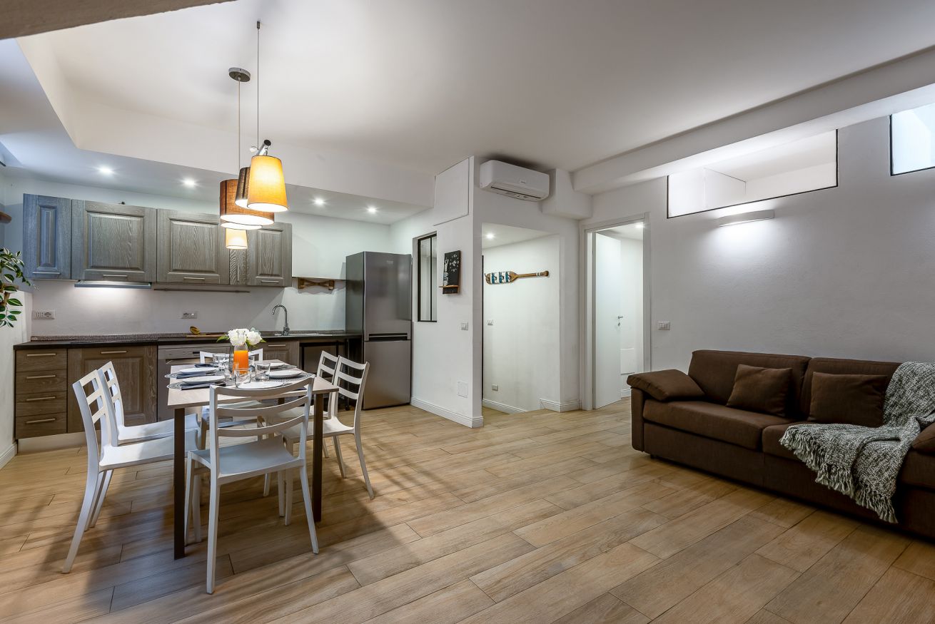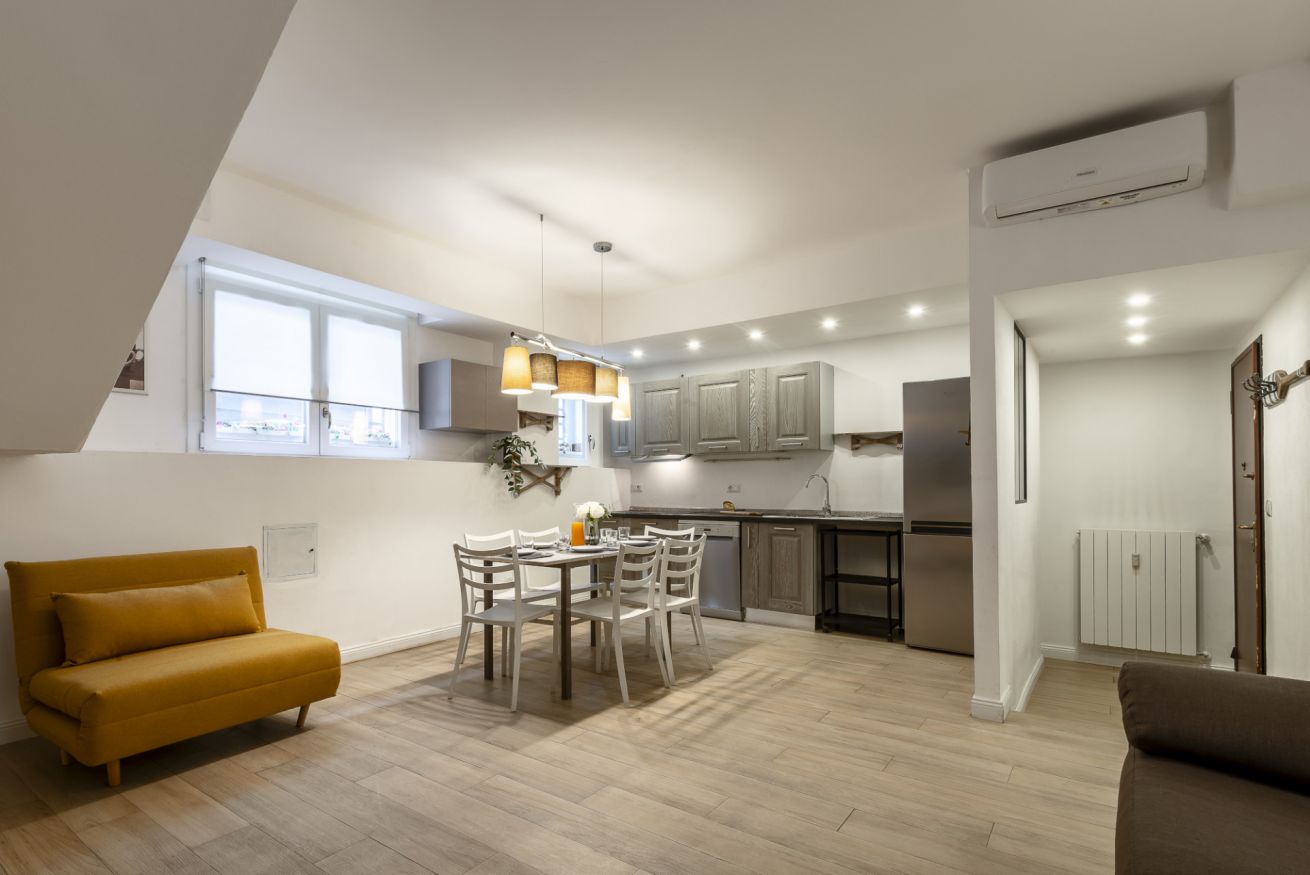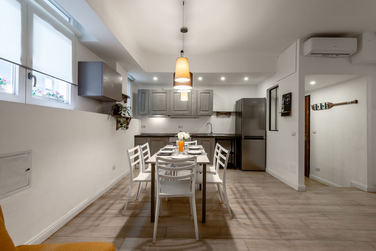 One-bedroom apartment on the semi-basement level, consisting of a living room with kitchen (with a sofa bed and an armchair bed), a guest bathroom (no shower), and a double bedroom with a full bathroom.