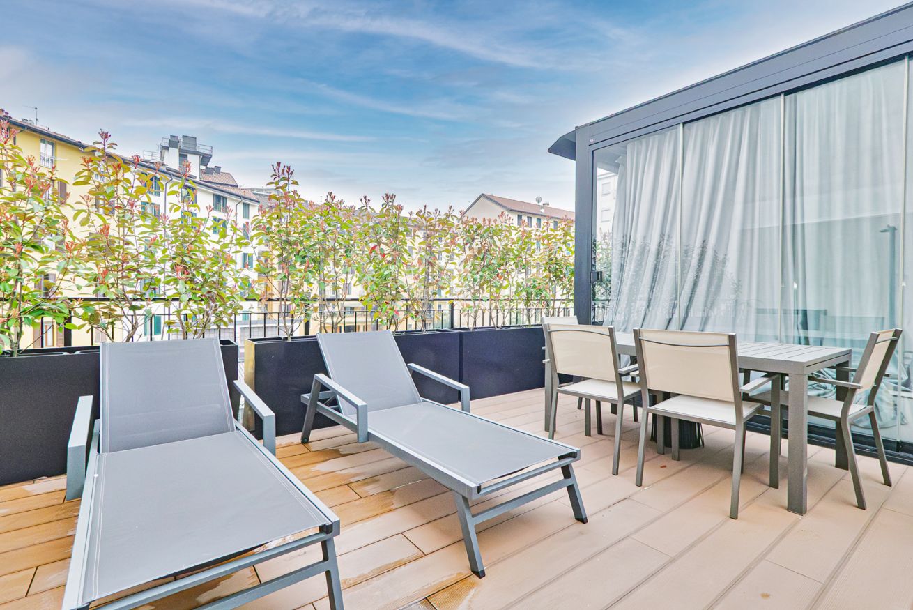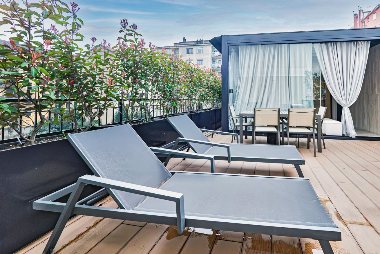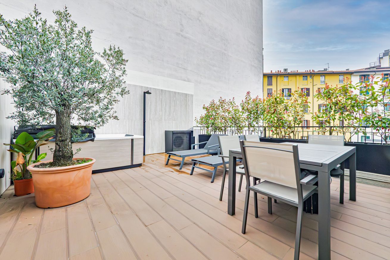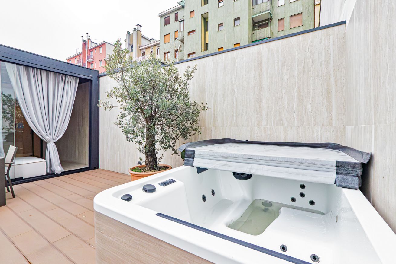 Luxurious apartment with a unique terrace in Milan: a covered relaxation area with TV, dining table, sun loungers, and a fabulous Jacuzzi hot tub.