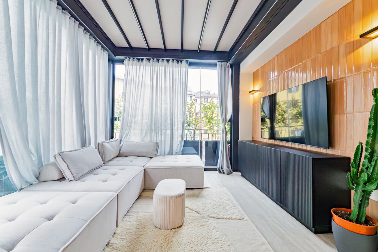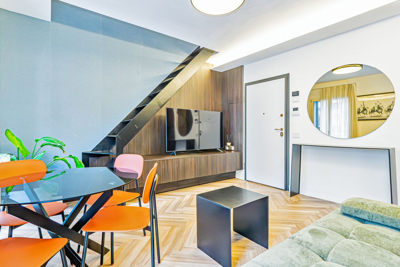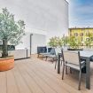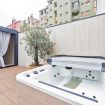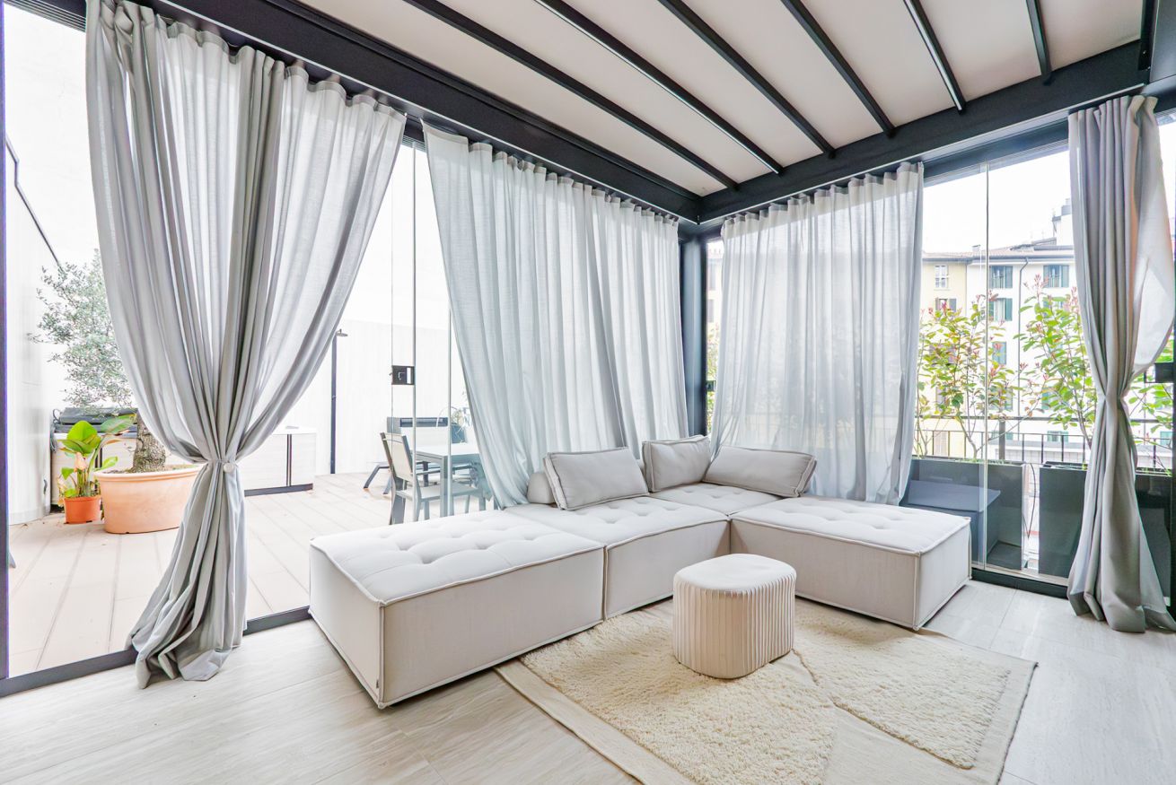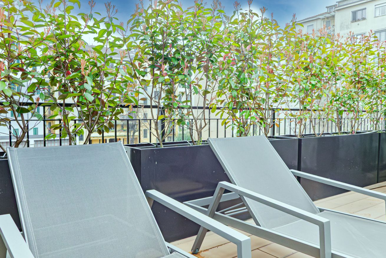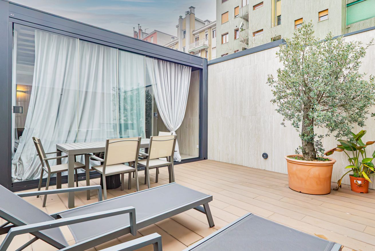 Luxurious apartment with a unique terrace in Milan: a covered relaxation area with TV, dining table, sun loungers, and a fabulous Jacuzzi hot tub.