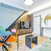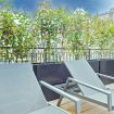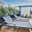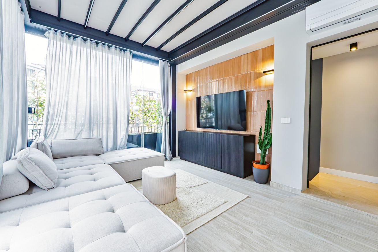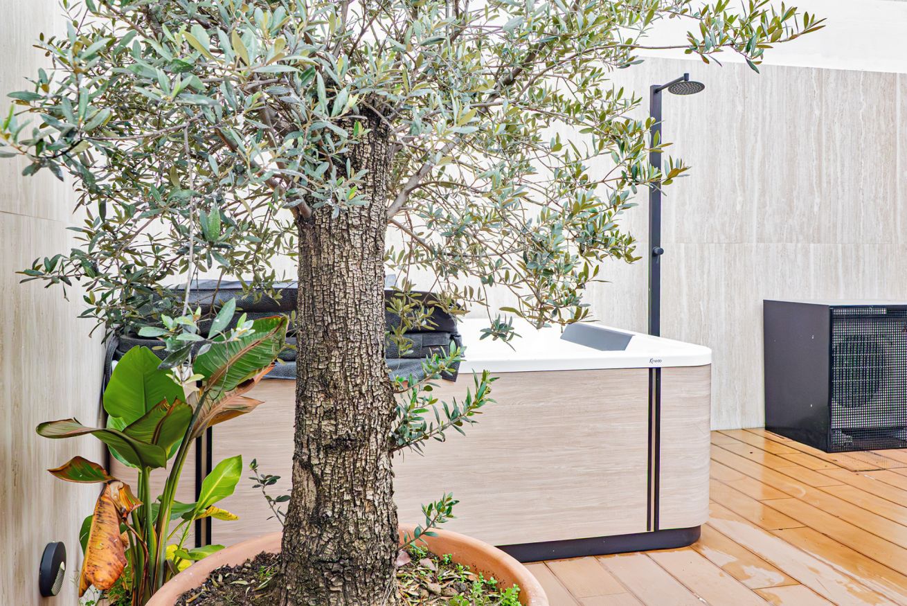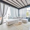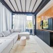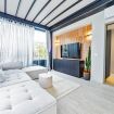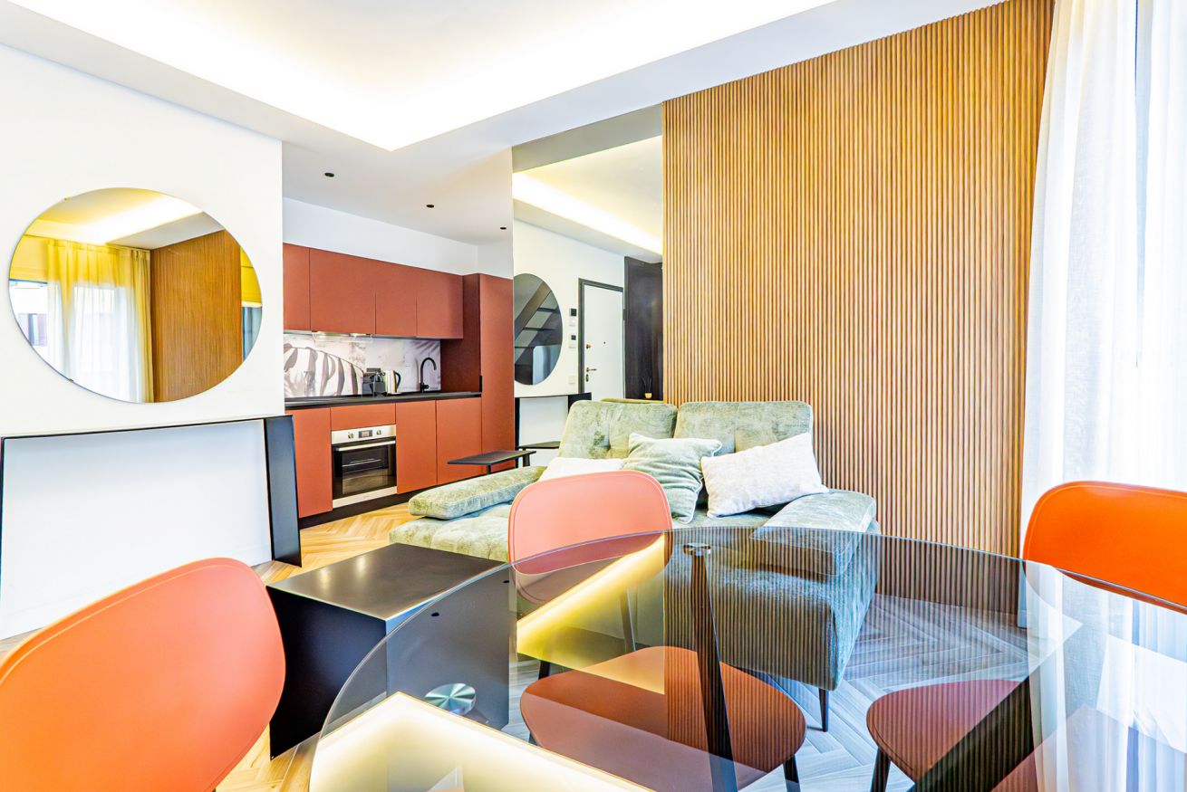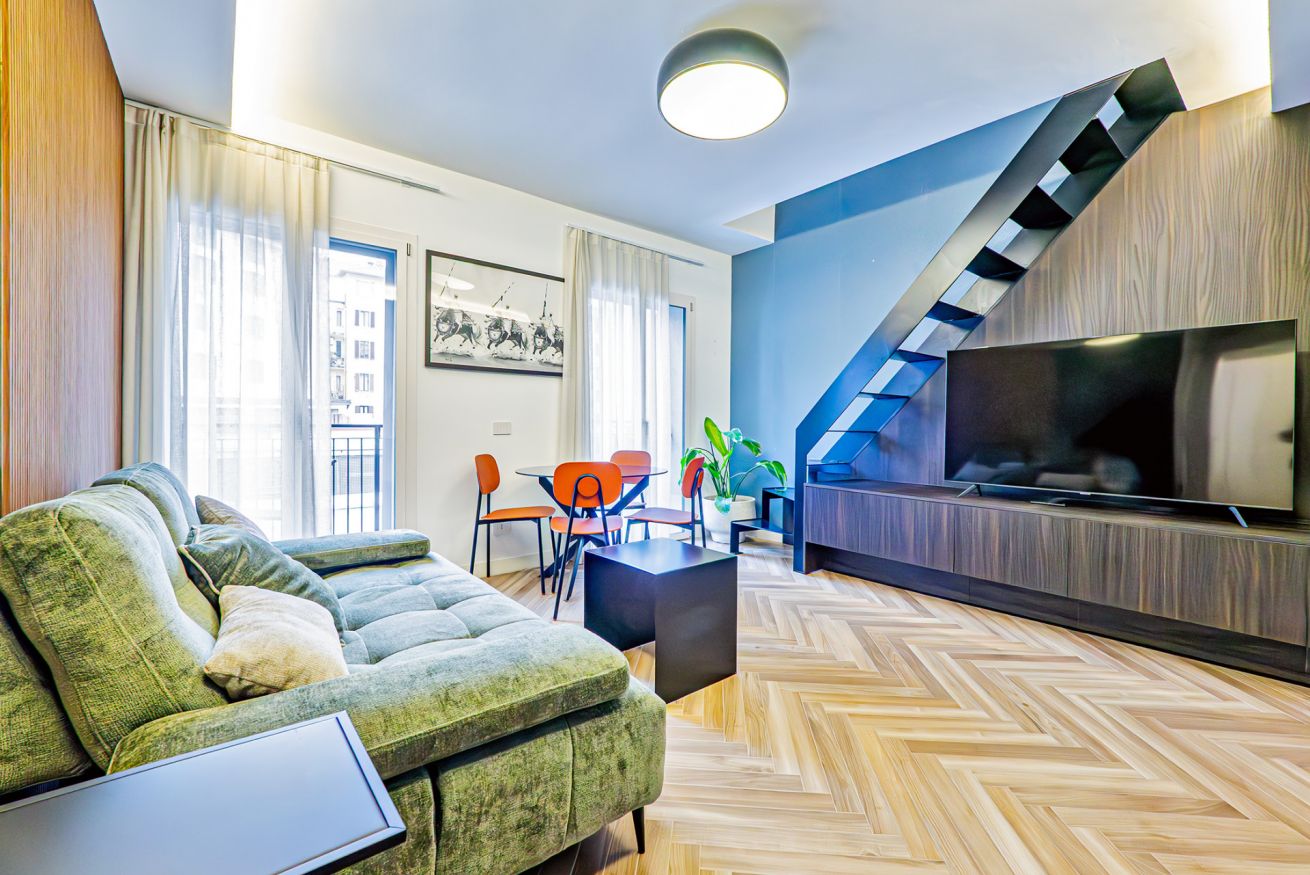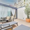 Luxurious apartment with a unique terrace in Milan: a covered relaxation area with TV, dining table, sun loungers, and a fabulous Jacuzzi hot tub.