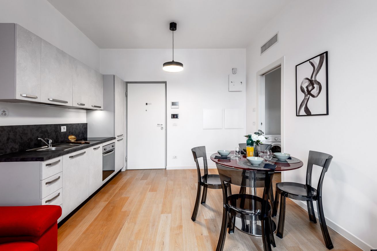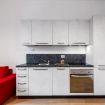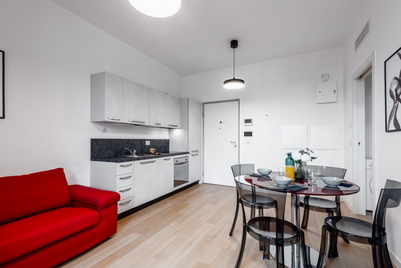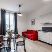 - Living area with fully equipped kitchen, dining table, and sofa bed