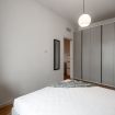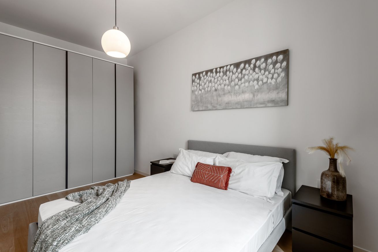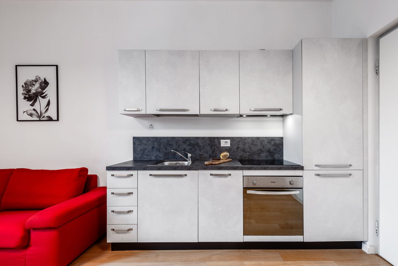 Modern one-bedroom apartment on the second floor with elevator: living area with kitchen and sofa bed, bathroom, and bedroom with a double bed.